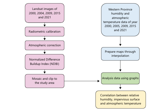 To achieve the specific objectives of the study, satellite images taken in different years were taken into consideration as the main data set. Satellite images can be considered one of the most reliable sources for investigating the temporal changes in impervious surfaces17. In this, Landsat images taken in January, February and March in the years 2000, 2005, 2009, 2015 and 2021 were downloaded from the United States Geological Survey (USGS) Earth Explorer website18. In selecting the cloud-free images from the master database, firstly, similar months were considered. Multi-spectral satellite images were used to estimate impervious surfaces in the Western Province area. The pre-processing part for radiometric and atmospheric corrections was done for all downloaded satellite images using ENVI (version 5.6) software to enhance the quality of the image (Fig. 1).