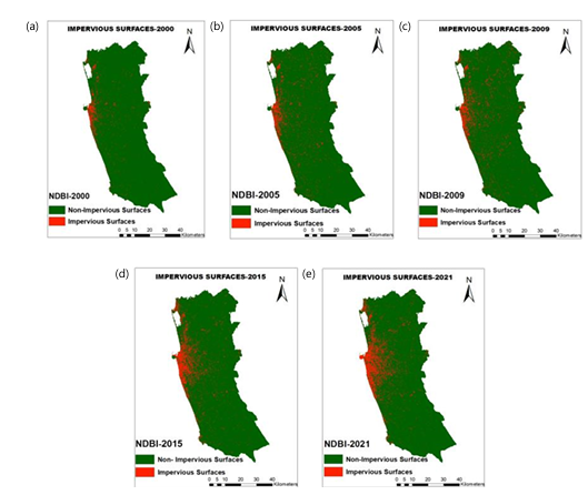 Threshold values were calculated for each year to categorize areas as impervious and non-impervious surfaces using 500 Ground Control Points (GCPs) on a Google Earth Image. The accuracy of this classification was assessed using another 200 points marked on a Google Earth image. Since the overall accuracy of all the images was good enough as expected, further analysis was conducted in the study (Table 1). As a result of this classification, Impervious surface area maps were produced for the years of 2000 (Fig. 2 (a)), 2005 (Fig. 2(b)), 2009 (Fig. 2(c)), 2015 (Fig. 2(d)) and 2021 (Fig. 2(e)).