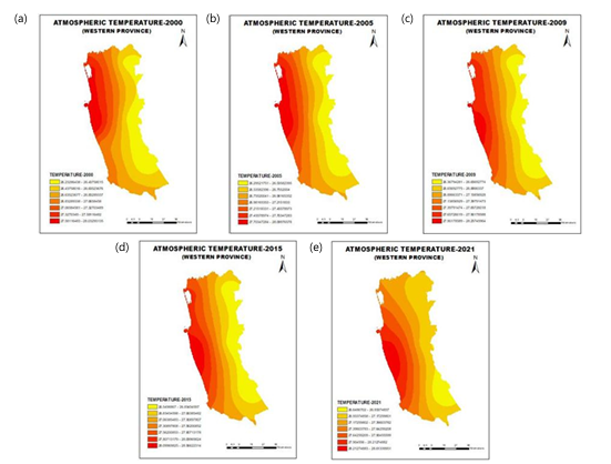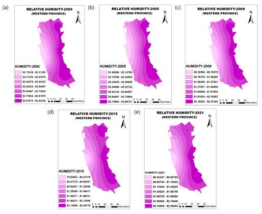 Atmospheric temperature and relative humidity data of the study area for the years 2000, 2005, 2009, 2015 and 2021 were collected from 10 meteorological stations, which were established by the meteorological department and the Central Environmental Authority of Sri Lanka. The kriging method of interpolation in GIS approach was used to prepare the distribution of atmospheric temperature maps for the year 2000 (Fig. 3(a)), 2005 (Fig. 3(b)), 2009 (Fig. 3(c)), 2015 (Fig. 3(d)) and 2021 (Fig. 3(e)) and relative humidity maps for the years of 2000 (Fig. 4(a)), 2005 (Fig. 4(b)), 2009 (Fig. 4(c)), 2015 (Fig. 4(d)) and 2021 (Fig. 4(e)) for the study area, since the calculation part of it gives a greater weight to the points that are close to the location of interest than to those that are further away.