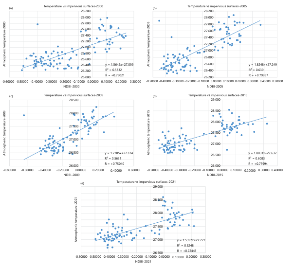 According to the statistical analysis of this study, it is clear that the relationship between atmospheric temperature and impervious surface coverage is very strong (Fig. 5). In 2000, the correlation coefficient was 0.7302 (Fig. 5(a)) and 0.7994 in 2005 (Fig. 5(b)). Further, in 2009, the coefficient value was 0.7504 (Fig. 5(c)) and the value in 2015 and 2021 were recorded as 0.7799 (Fig. 5(d)) and 0.7244 (Fig. 5(e)) respectively. In summary, since all these values were more than 0.7, it can be concluded that the relationship between atmospheric temperature and the presence of impervious surface coverage is highly correlated positively.