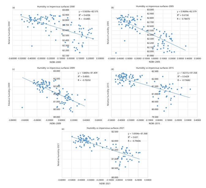 This positive correlation means the atmospheric temperature increases when the impervious surface area increases. This result showed that changes in the impervious surface area coverage strongly affect the atmospheric temperature. Secondly, the study attempted to identify the relationship between the relative humidity and the coverage of impervious surface area for the study area. The correlation coefficient between these variables was (-0.6485) in 2000 (Fig. 6(a)) and (-0.7847) in 2005 (Fig. 6(b)). And, the statistical analysis found that the correlation between the two variables is (-0.7025) in 2009 (Fig. 6(c)). However, the values were (-0.7368) and (-0.79436) for 2015 (Fig. 6(d)) and 2021 (Fig. 6(e)) respectively. Since all these values are greater than 0.7 and negative in nature, it can be concluded that there is a strong relationship between the relative humidity and impervious surface coverage.