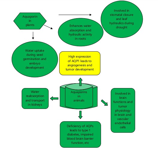 For a second time in another experiment, shockingly, down-regulation of VvPIP2; 1 aquaporins can be seen during drought conditions. Therefore, very contrasting results have been observed between similar aquaporin homologs within the same species under drought stress. Reported that arbuscular mycorrhizal symbiosis with maize plants can control the various expressions of aquaporins differently during both temporary and extended drought stress conditions14. Studies conducted in naturally drought-tolerant plant species to approximate aquaporins role during drought conditions. A drought-tolerant plant, Eragrostis nindensis (resurrection grass), has TIP3; 1 in small vacuoles of its leaves, which plays a major role by improving the mobilization of water and solute molecules from those small vacuoles after rehydration. The transgenic plant shows better resistance and enhanced growth and development when subjected to drought stress. Animal AQPs also played a huge role in the homeostasis of water balance in the animal body. The AQPs found in the kidney, mainly the AQP2, are associated with osmoregulation and water homeostasis. They do so by activating the ADH hormone during water-deficient conditions, reabsorbing large amounts of water, and producing very concentrated urine as output15.