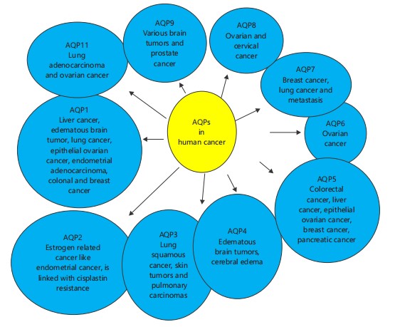 In between the metastatic carcinomas, the expression of AQP is seen in glioblastoma cells and not in the parenchyma or normal micro vessel endothelium of the normal brain32. Jiang verified that the expression of AQP1 can be found in quite a few cancer cell lines and also in a colon cancer model of human HT2033. It is found that in case of breast cancer an increased expression of AQP1, 3 and 5 has been found. It is seen that during the advancement of particular lung squamous cell cancer the expression of AQP3 increases and not during the adeno carcinoma cells. As the AQP3 are predominantly found or expressed in the human skin so in a research conducted on the mice model it is found that the mice model where the AQP3 were absent they were devoid of skin tumors and are resistant to it even after the exposure to tumor causing chemical such as phorbol ester as compared to the one in which the AQP3 were present. Alike AQP1 the AQP3 also participates in the development of pulmonary carcinomas. As AQP4 is a water channel specifically present in the brain so the involvement of its expression can be seen in the development and progression of brain-related carcinomas like brain tumors, cerebral edema etc.34. Also it controls the water flow movement in the brain in the bidirectional way so the chances of the occurrence of edema in the presence of its expression are quite common. Over expression of AQP5 can cause cancers like pancreatic cancer, colorectal cancer etc. The study report given by Woo et al., states that the overexpression of AQP5 can instigate the Ras pathway which can eventually lead to the activation of oncogenic pathway. In one study it is found that the over expression of AQP8 lead to the cervical cancer and ovarian cancer. The vigorous expression of AQP9 can be seen in case of various brain tumors. Also it has a clearance effect for glycerol and lactate, which eventually lead to the elevation of lactic acidosis in the body causing cancer.